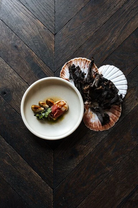 Brioche. Gemarineerde coquille. Platte kaas. Prei. Hazelnoot.